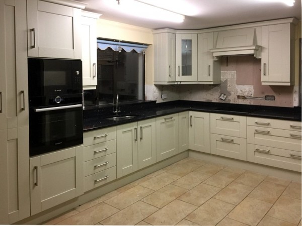 Hand-painted mussel kitchen, combined with dark worktops - designed and fitted by Barrett Kitchens, Donegal, Ireland